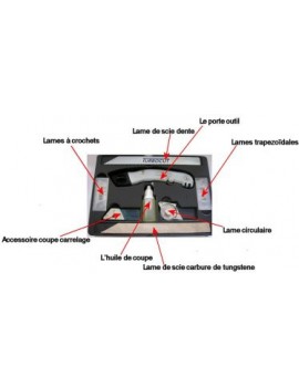 Le COFFRET TURBOCUT AVEC COMPAS contient : - 5 LAMES A CROCHETS- 1 COMPAS- 1 PORTE OUTIL- 5 LAMES TRAPEZOIDALES- 1 ACCESSOIRE COUPE CARRELAGE- 1...